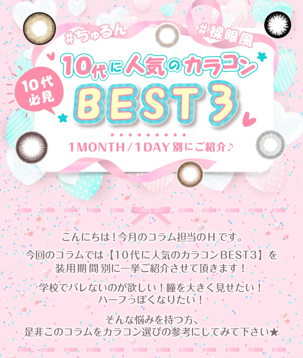 カラーコンタクトレンズTeAmoのコラム担当Hです。 こちらのコラムでは、10代に人気なカラコンBEST3をご紹介いたしました! 学校やバイト先などで使いやすい「バレないカラコン」がワンマンスでもワンデーでも特に人気でした! このコラムを参考に、ぜひTeAmoのカラコンを試してしてみてくださいね! TeAmoのカラコンはまとめ買いが超お得です♪