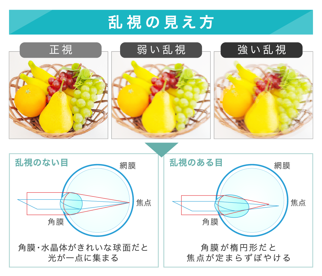 しかし、乱視のある目は角膜や水晶体の形がわずかに歪んでいるため、光が複数の焦点に分散してしまい、遠くや近くの物がぼやけたり、歪んで見えることがあります。