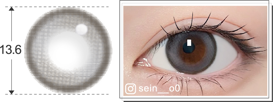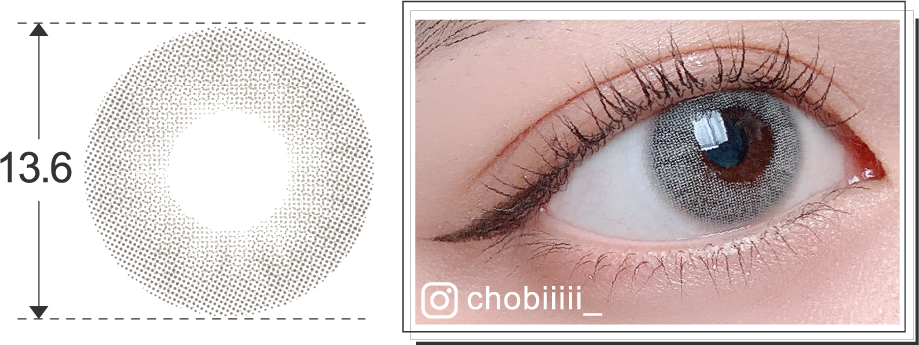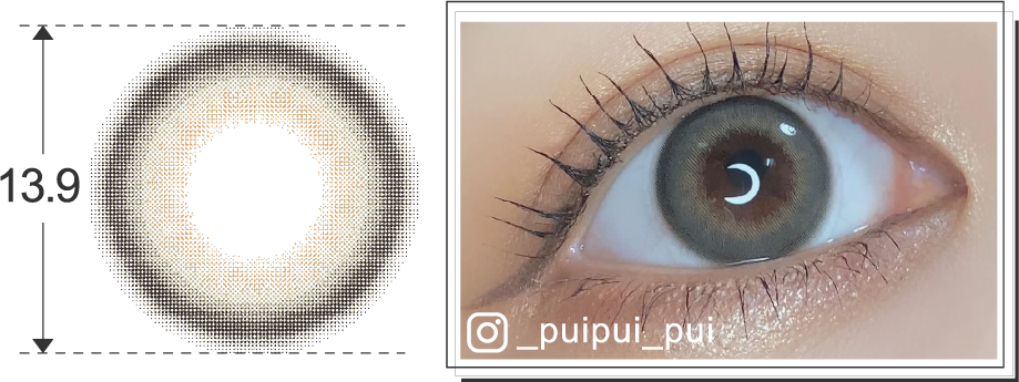 大きすぎず小さすぎない程よいサイズのツインハイライト入りグレーカラコンで、ツイントブラウンの色違いです。