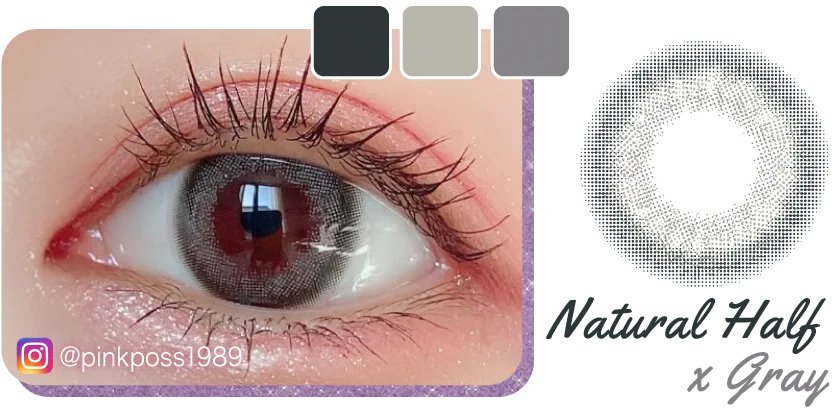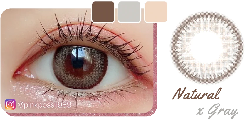 くすみピンクと相性ばっちりなグレーのツヤありカラコン!落ち着いた発色だからフェミニンに♡